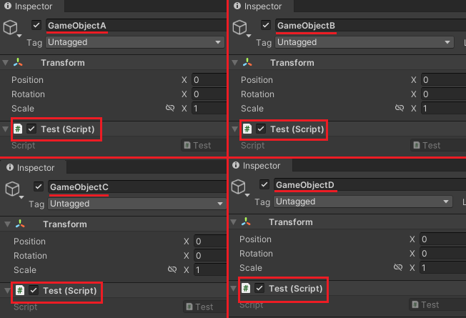 게임 오브젝트 4 개를 배치한 뒤, 위의 Test.cs 스크립트를 컴포넌트로 추가한다.