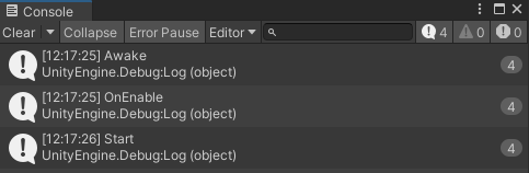 게임을 실행시키면, 아래의 사진과 같이 Awake 가 4번 호출되는 모습을 볼 수 있다.