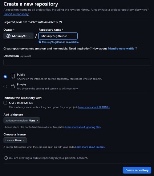 Repository name * 에 {username}.github.io 를 입력합니다.