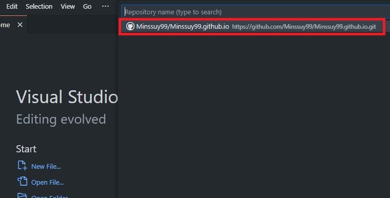 그럼 아까 전 저희가 생성해두었던 {username}.github.io 가 선택창에 나타나게 됩니다.