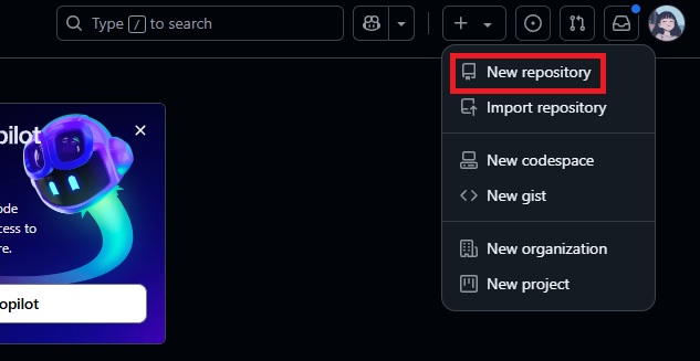 Github 의 우측 위에 보이는 + 를 클릭 후, New repository 를 선택합니다.